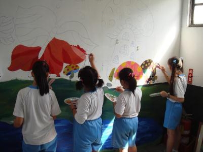 (1)空間美化:邀請工程美學小組的老師們共同觀察並給予規劃建議─讓學生利用空閒及假日時間將本校所擁有的動植物生態,彩繪在牆壁上,除了增加空間美觀,也藉此讓學生了解校園內的環境生態。