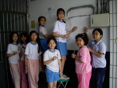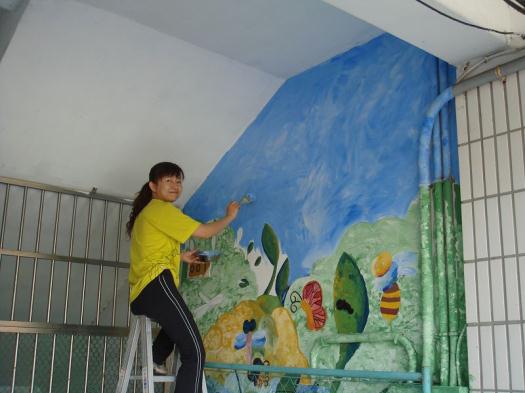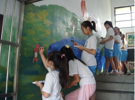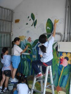 在彩繪樓梯的牆面時,由於樓梯的差距較大,而且小學生的身高普遍都不高,導致較高的地方,學生不容易畫得到,所以只好拿出梯子來讓學生作畫,這時,學生就不會感到困難,而且也可以較盡情的發揮想像空間,構圖時就不會只侷限於自己身高的限制。