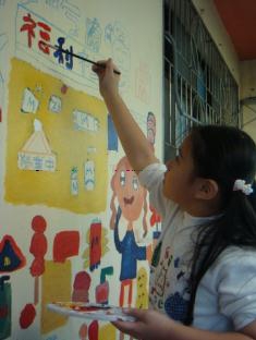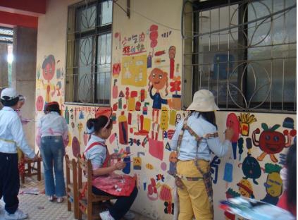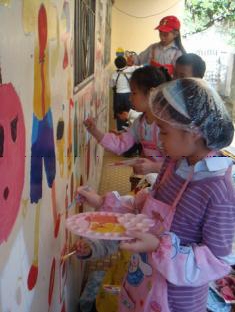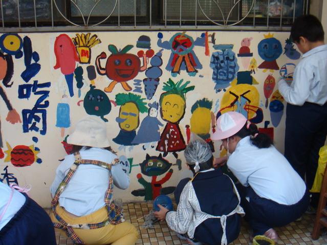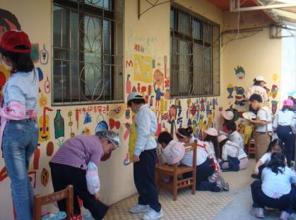 這次的活動讓小朋友的繪畫空間由圖畫紙延伸到了校園內的牆壁,素材從水彩、蠟筆等小朋友常用的媒材延伸到了水泥漆,對於老師及學生都是一大挑戰。