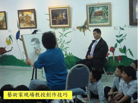 而為了讓學生能與藝術家進一步做接觸,我們特別在參展的每一天,邀請畫家為學校的孩子進行「與藝術家有約」的活動。在每天的早上,都有一位藝術家為班級的學生進行畫作的導覽與介紹,解說他(她)是在什麼情境下進行創作,創作的歷程是需要要耗費極多的心力與時間,如余進長在進行汐止農家生活的畫作,是歷經三個多月、每天從早到晚才完成。此外,我們也邀請畫家到現場作畫,如藝術家廖進發先生現場進行水墨畫創作、葉燕城先生進行現場素描;藝術家透過現場作畫解說如何要如何下筆、構圖、色彩、陰暗的處理等,此刻的學生,無一都目不轉晴注視著畫家的作畫,此時有一老師進到茄苳溪藝術館中,不知畫家和學生再做什麼,便問了學生說:「你們在做什麼?」此時,有一學生很正經的將一個手指放在嘴巴前面說:「噓!請不要大聲講話!畫家現在正在作畫及表演。」由此可知,學生與藝術家互動是非常認真而有學習力的。 我們透過校園閒置空間的規劃與整合,帶著藝術家熱情的藝術種子進入校園,透過藝術作品的展覽、藝術家的現場導覽、創作者的即景寫生等多元的真實學習情境,導引學生學習思考、雙面溝通、發表的能力。 |