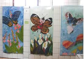 同時,我們也將這個議題拋給學生,邀請老師和學生一起彩繪,於是師生就一間一間的彩繪、一間一個主題的產生,如蝴蝶、青蛙、甲蟲、魚、鳥等主題。其中還有學生因為很有成就感,要求要包下一間廁所來彩繪。於是透過師生的巧手與創意,化腐朽為神奇的形成有創意的廁所美術館,讓每一位進入廁所的人,不僅可以解決生理需求,也可以有一股溫暖的感動。