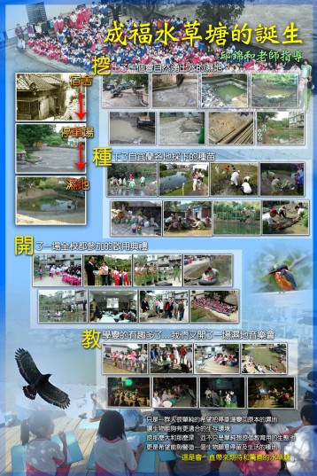 坦白講,溼地對於現在的孩子來說是個十分陌生的地方,即使我們地處於山邊水旁的橫溪地區,野外還擁有許多類溼地的環境,但種種的限制與誤解,還是讓孩子沒有機會去認識溼地。那些長著水草、綻著小花,偶爾還傳來的悅耳蛙鳴鳥叫的美麗溼地,對現在的孩子來說,不過像是車窗外的景色般。但是成福的水草塘,讓孩子有機會去認識溼地的美麗景色、豐富生態及不可取代的重要性,這裡可說是兼具「生物多樣性棲地」及「多面向生態教室」的發展性教學場域。老師們將水草塘當成萬用教室,把草塘中有形的、無形的事物,當成教學的素材,發展出別具創意與樂趣的課程。讓溼地課程變成一系列強調實作與感受的課程,從前端的拋擲水草,到後端的紀錄管裡,都是由成福師生共同參與的一段學習與付出的過程,不只孩子有收穫,老師也從中獲得大量的專業成長,並且體現了創意發展與生活實踐,交織而成校園的意識覺醒與改變。