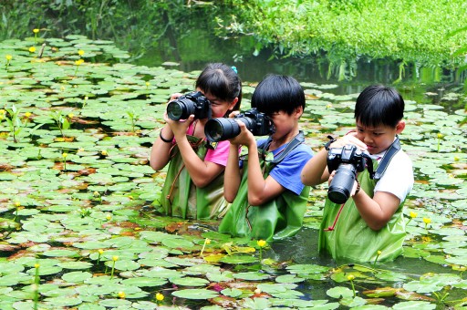 學校的水草塘,是我心中理想的觀察場域,更是我心中最理想的攝影教學場所。在水草塘完成前,我便已經在構思,如何把攝影與水草塘結合在一起?要準備青蛙裝、要有完善的課前準備、要先跟孩子溝通怎麼拍照……。而後,當孩子真的走進水裡,觀察著自然的生態以及每一種昆蟲、每一種花草時,這個理想終於有了進一步的實現。手握著相機,讓孩子們更有「觀察生態」的動機,他們開始等待,他們開始耐著性子,他們開始靜靜地融入水草塘,也靜靜地融入了生態攝影。而我們欣喜地見到,孩子們無論是否是上課或是放學,都愛在水草塘旁邊留連。他們有時在這裡和同學聊天說笑,有時幾個人湊在一起,看著偶爾前來拜訪水草塘的嬌客們,一陣驚呼或是一陣屏氣凝神。生態的美、攝影的美,都在他們心中烙印了深深的印象。