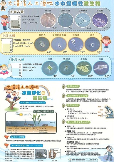 又為使解說具體化,特別設計相關教材,提供參訪學生、民眾了解水質監測除運用儀器與藥劑外,亦可透過觀察水體內動植物及微生物生存狀況,以推估水質概況(如下圖)。
