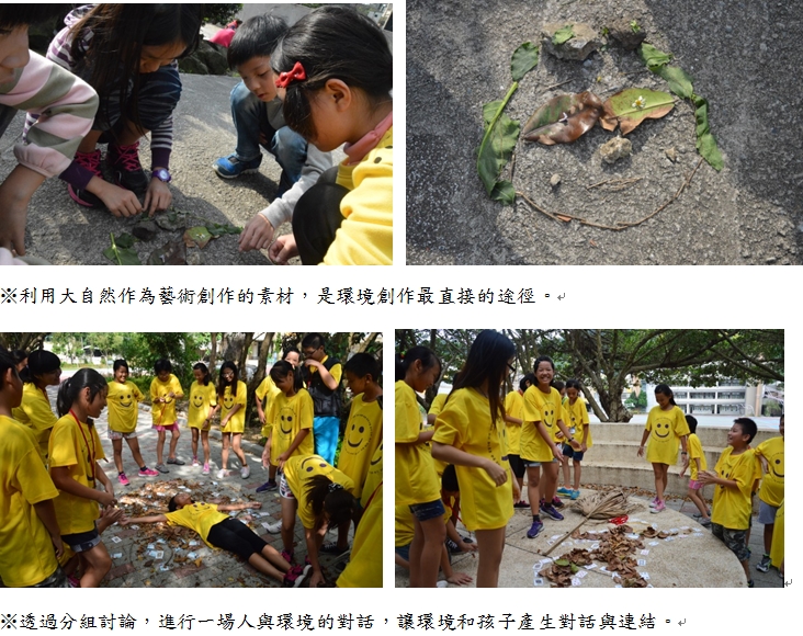 「藝術生活化,生活藝術化」,如何讓孩子在生活中感受到美,到戶外是最快、最直接的方法。帶孩子到戶外,運用五官感受四季、體會環境的氛圍,就是一種美感的薰陶。接著讓孩子觀察週遭環境有什麼素材可以拿來創作呢?在大家的集思廣益下,利用自然物進行小組拼貼創作。這時會發現,每個人喜歡的東西不一樣,挑選的自然物也不相同;有的人喜歡花草,有的人喜歡石頭,有的人會細心地找到植物的種子,還有人會利用樹枝來增加量感,唯一不變的原則是---不要為了創作而摘花、拔葉子。就這樣,一幅幅的圖畫出現了。因為不用繪畫,所以想法可以更加天馬行空。有的組作出了一幅「蒙娜麗莎的微笑」,有的組還有動態的畫面,每一幅作品都是孩子的想法,最後請小組為作品命名,還要說明創作的想法及每個作品的內容。在過程中,除了讓孩子學習合作進行集體創作,也可以互相觀摩腦力激盪,透過互相提問,更可以培養孩子學習表達與詮釋作品。活動的最後,我們選擇讓作品留在原地跟路過的居民一同分享,取之於大地,回歸於大地。這樣的創作,信手捻來,融合於環境之中,這也是教師在課堂上相當容易運用的方法,只要走出戶外,處處都是創作的材料。